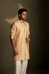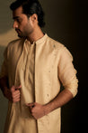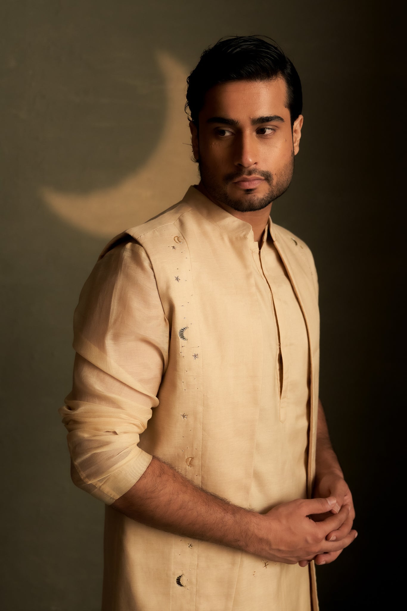 Introducing the Beige Long Open Jacket Set, a men’s kurta pyjama ensemble that blends timeless style with celestial accents. The long-sleeved kurta features an extended front yoke adorned with delicate star motif embroidery and a few glass crescent moons along the yoke edge. Paired with a long open jacket showcasing matching embroidery and straight pyjamas, this set delivers an understated yet elegant festive appeal.