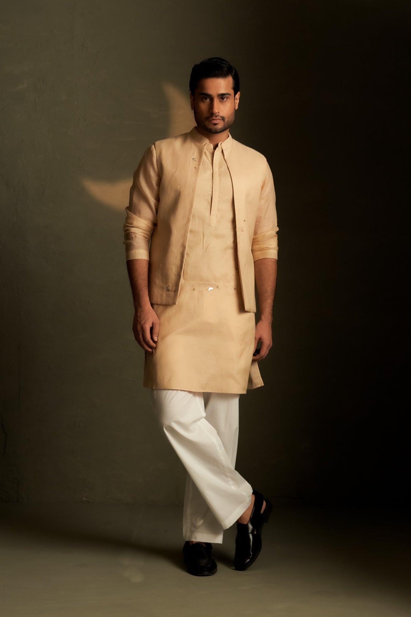 Introducing the Beige Short Jacket Set, a men’s kurta pyjama ensemble that blends timeless style with celestial accents. The long-sleeved kurta features an extended front yoke adorned with delicate star motifs and a few glass crescent moons along the edge. Layered with a short open jacket embroidered at the front with star motifs and glass crescent moons arranged in an artful scatter, and paired with straight pyjamas, this set offers an understated yet distinguished festive look.