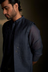Introducing the Blue Dusk Long Kurta Set with Short Jacket, a men’s ensemble that combines classic style with subtle celestial detailing. The long-sleeved kurta features an extended front yoke adorned with delicate star motifs and a few glass crescent moons along the yoke edge. Layered with a short open jacket embroidered at the front with an artful scatter of star motifs and glass crescent moons, and paired with straight pyjamas, this set offers an understated yet distinguished festive look.