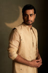 Introducing the Golden Beige Long Kurta Set with Long Jacket, a men’s ensemble that merges timeless style with subtle celestial accents. The long-sleeved kurta features an extended front yoke adorned with delicate star motif embroidery and a few glass crescent moons along the yoke edge. Layered with a long open jacket showcasing matching embroidery and paired with straight pyjamas, this set offers an understated yet elegant look, perfect for festive occasions.