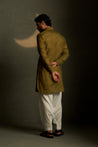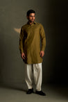 Introducing the Olive Dusk Pathani Kurta Set, a men’s relaxed-fit kurta that combines traditional design with distinctive detailing. Subtle star motifs and glass crescent moon embroidery adorn the placket and sleeve cuffs, with matching accents on the inner sleeve loops for a refined touch. Paired with a classic salwar, this set delivers a festive look that is both elegant and effortlessly unique.