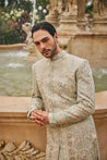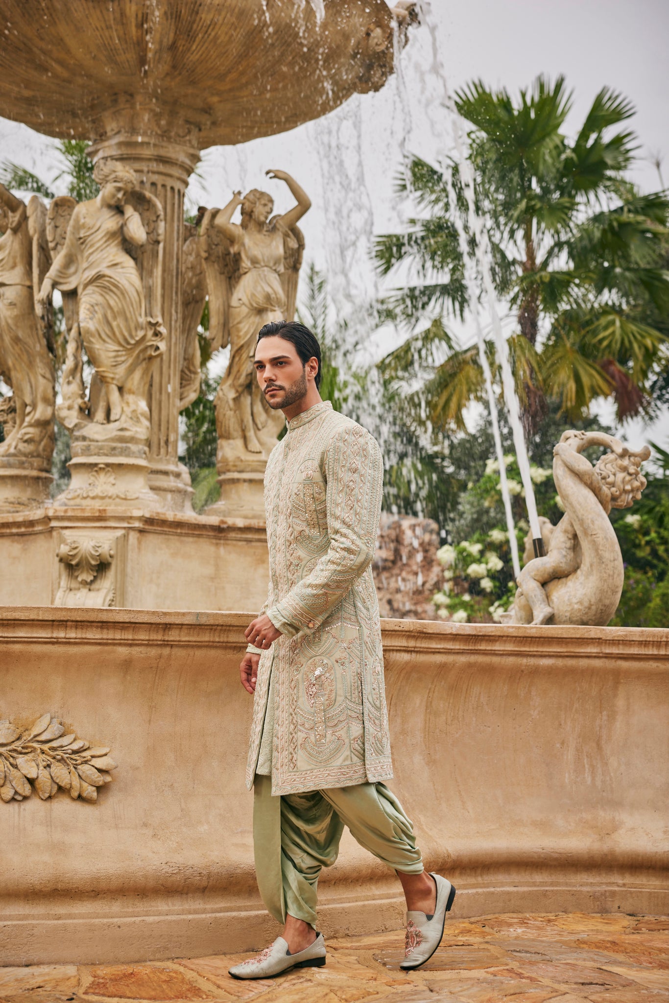 This Powder Sage Green sherwani is crafted on luxurious shimmer tissue fabric and adorned with intricate thread and zardosi embroidery that exudes understated royalty. Paired with a textured kurta featuring tonal threadwork and classic dhoti pants, the ensemble offers a perfect balance of tradition and contemporary flair. The standout element is the dupatta, showcasing exquisite peacock embroidery and a distinctive cut that adds drama and grace.