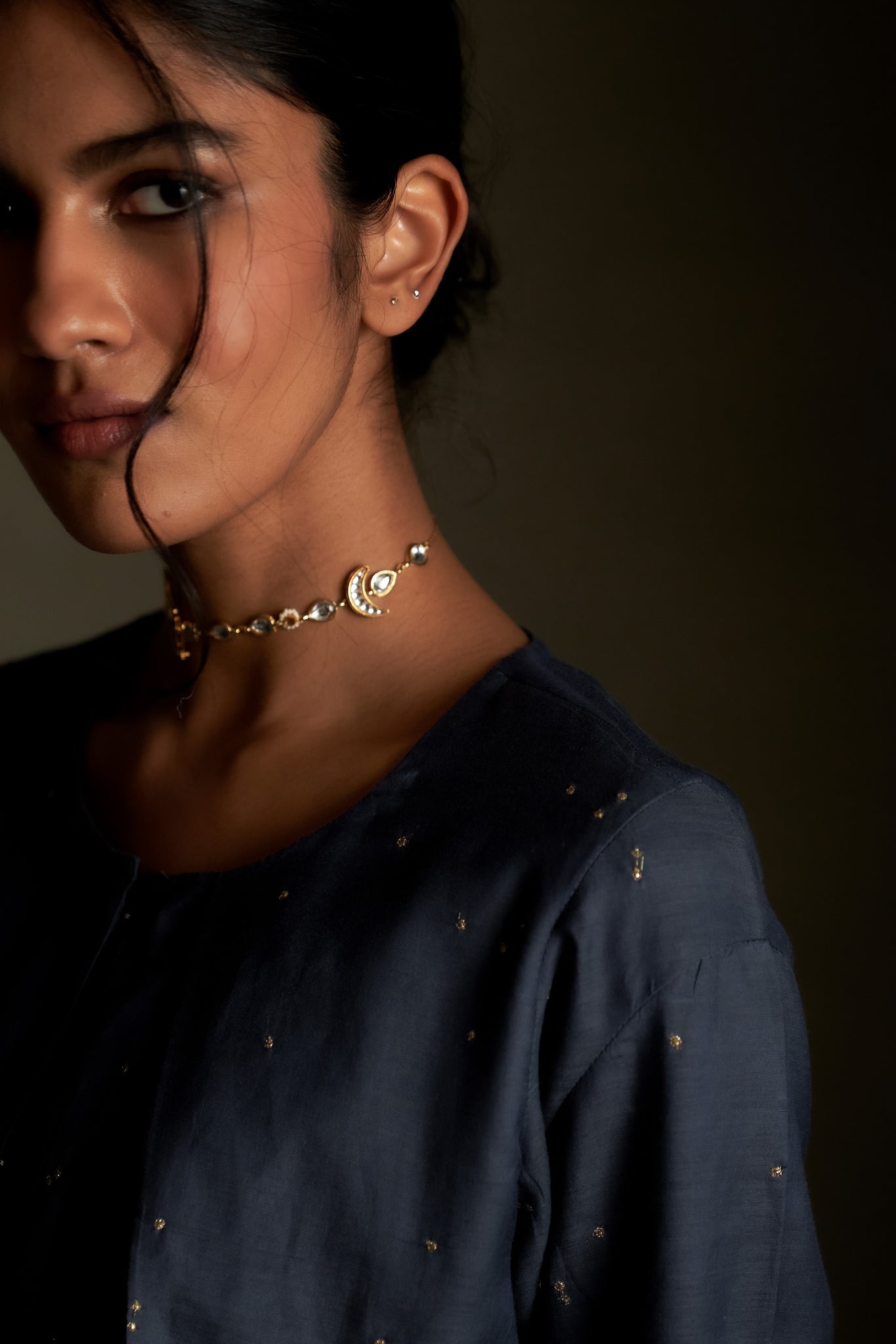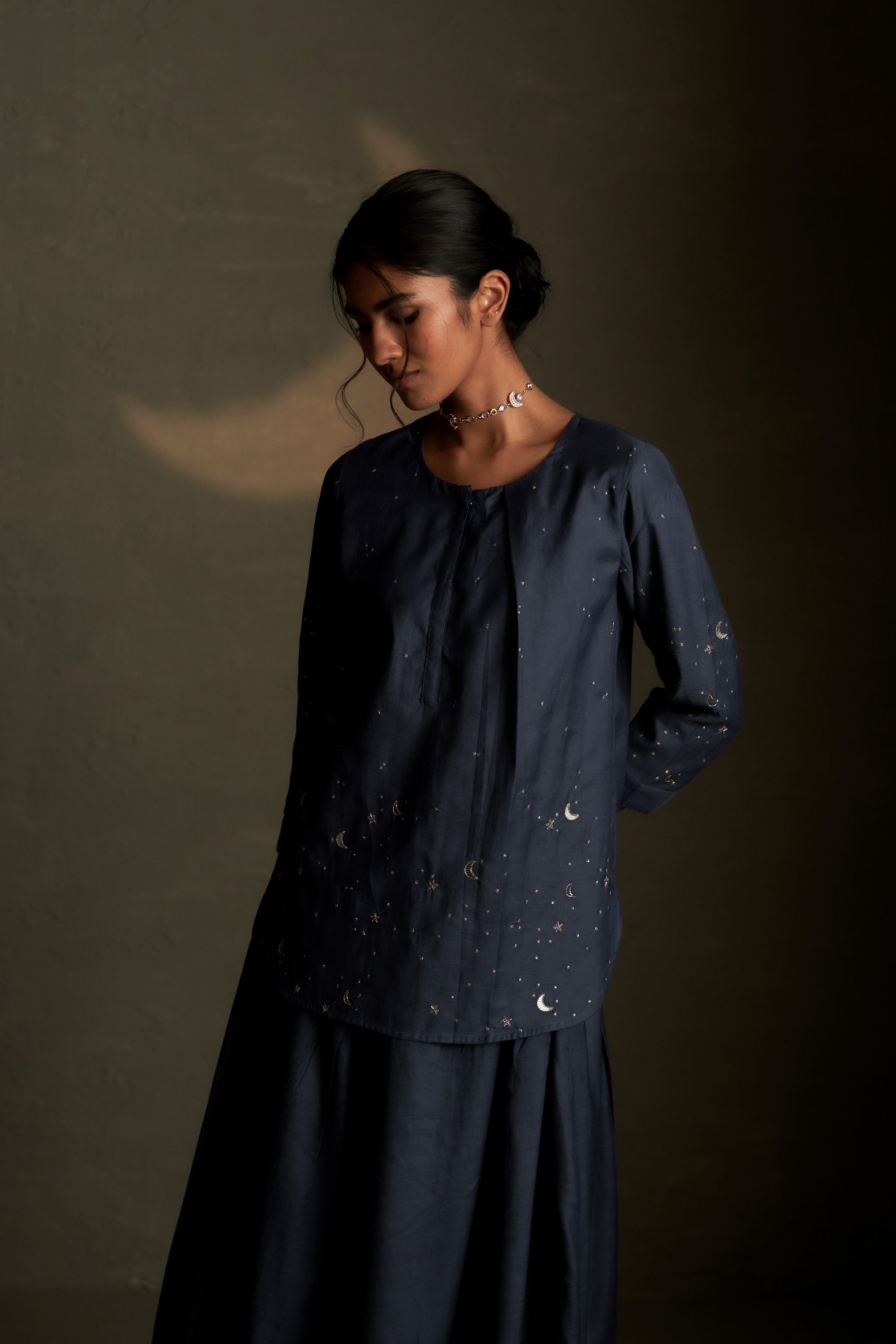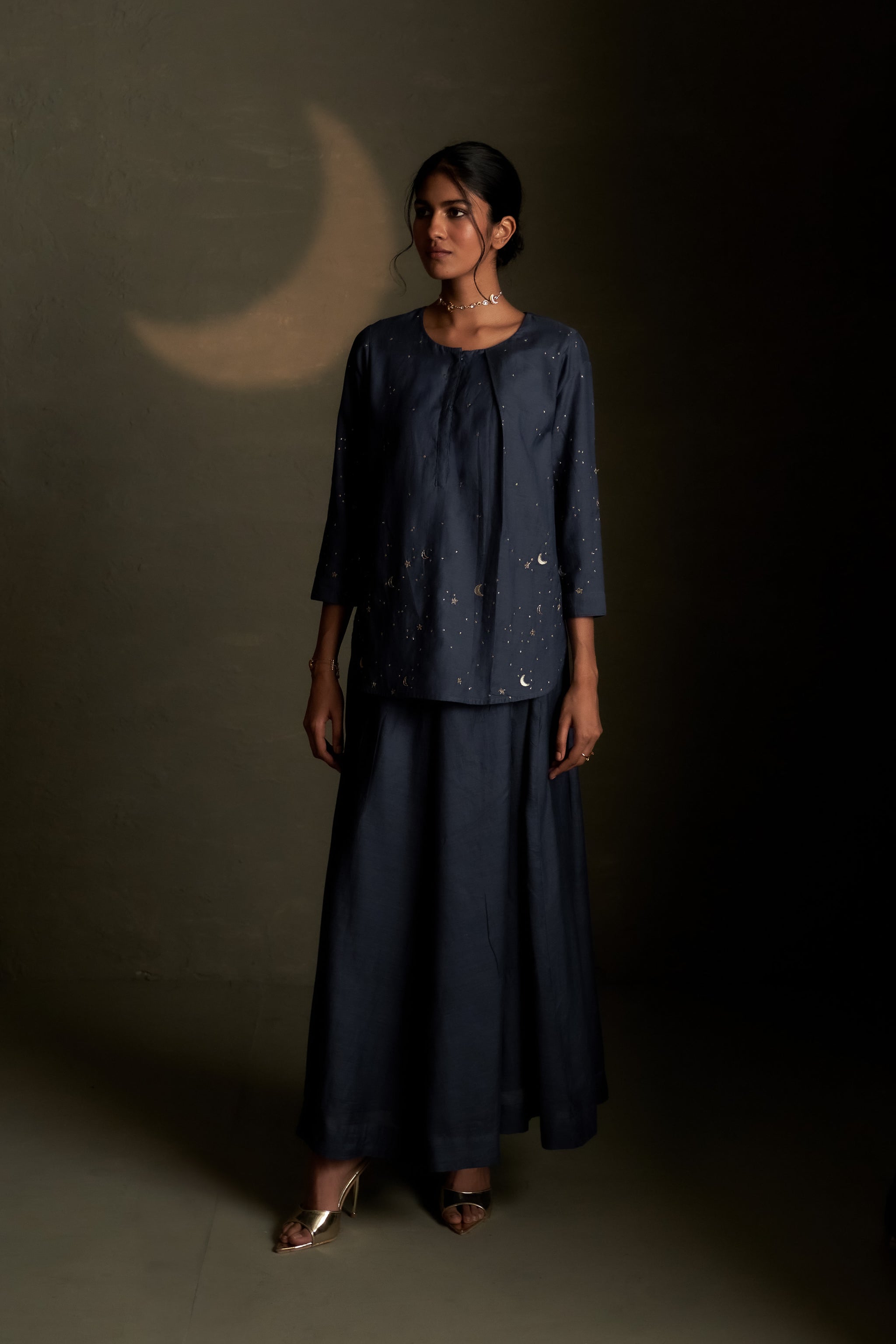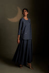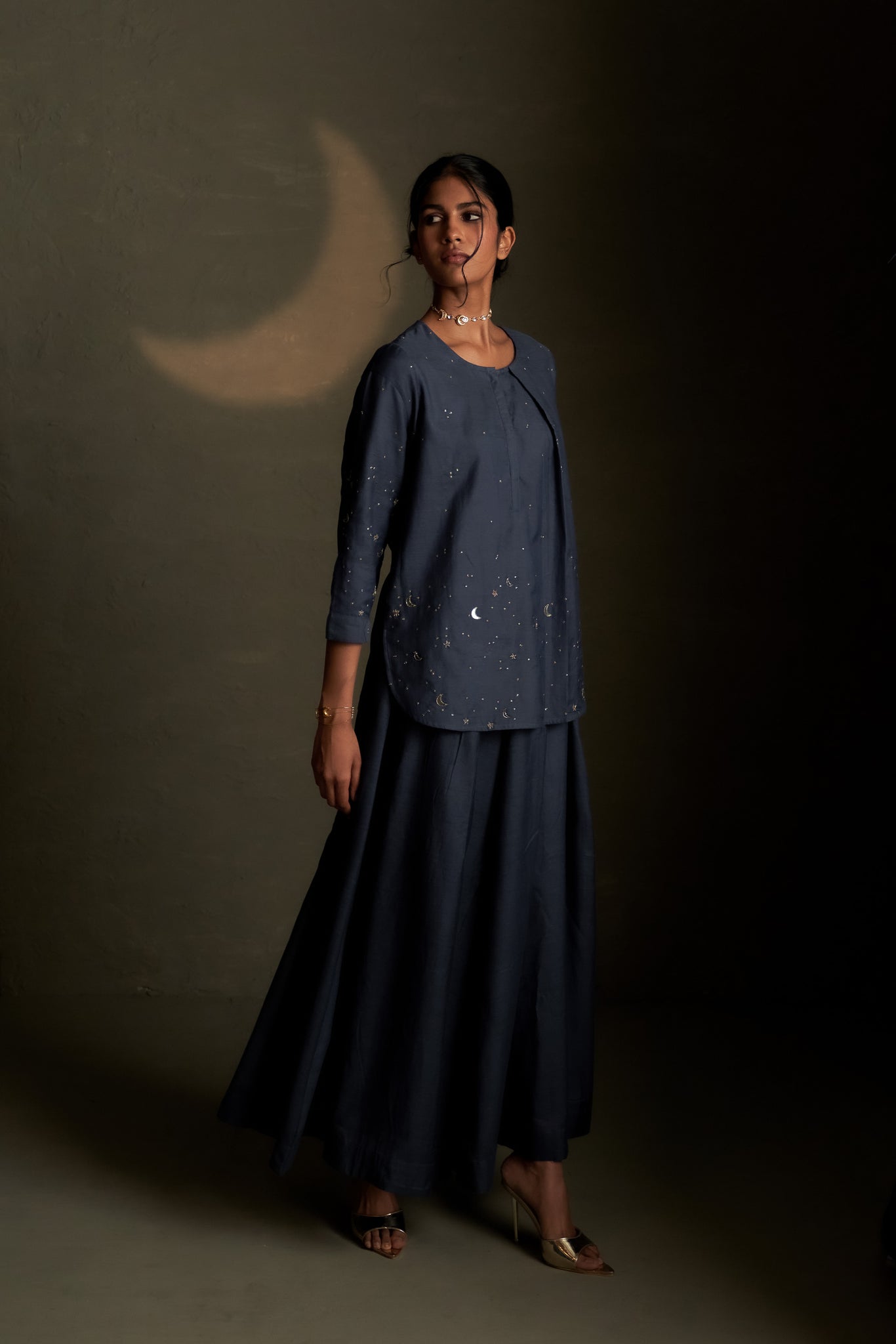 Introducing the Blue Dusk Chaand Kurti Skirt Set, a deep blue ensemble that beautifully captures the essence of subtle festivity and modern grace. It features a flared, divided skirt paired with a short kurta-style top, intricately embroidered with delicate star motifs and a crescent moon in glass. Thoughtfully designed to balance tradition with contemporary charm, this outfit exudes timeless elegance and refined sophistication.