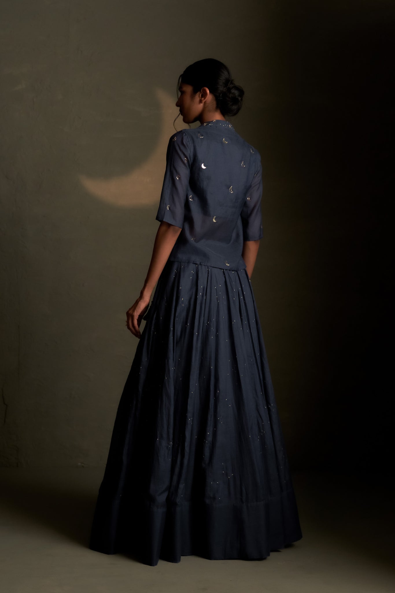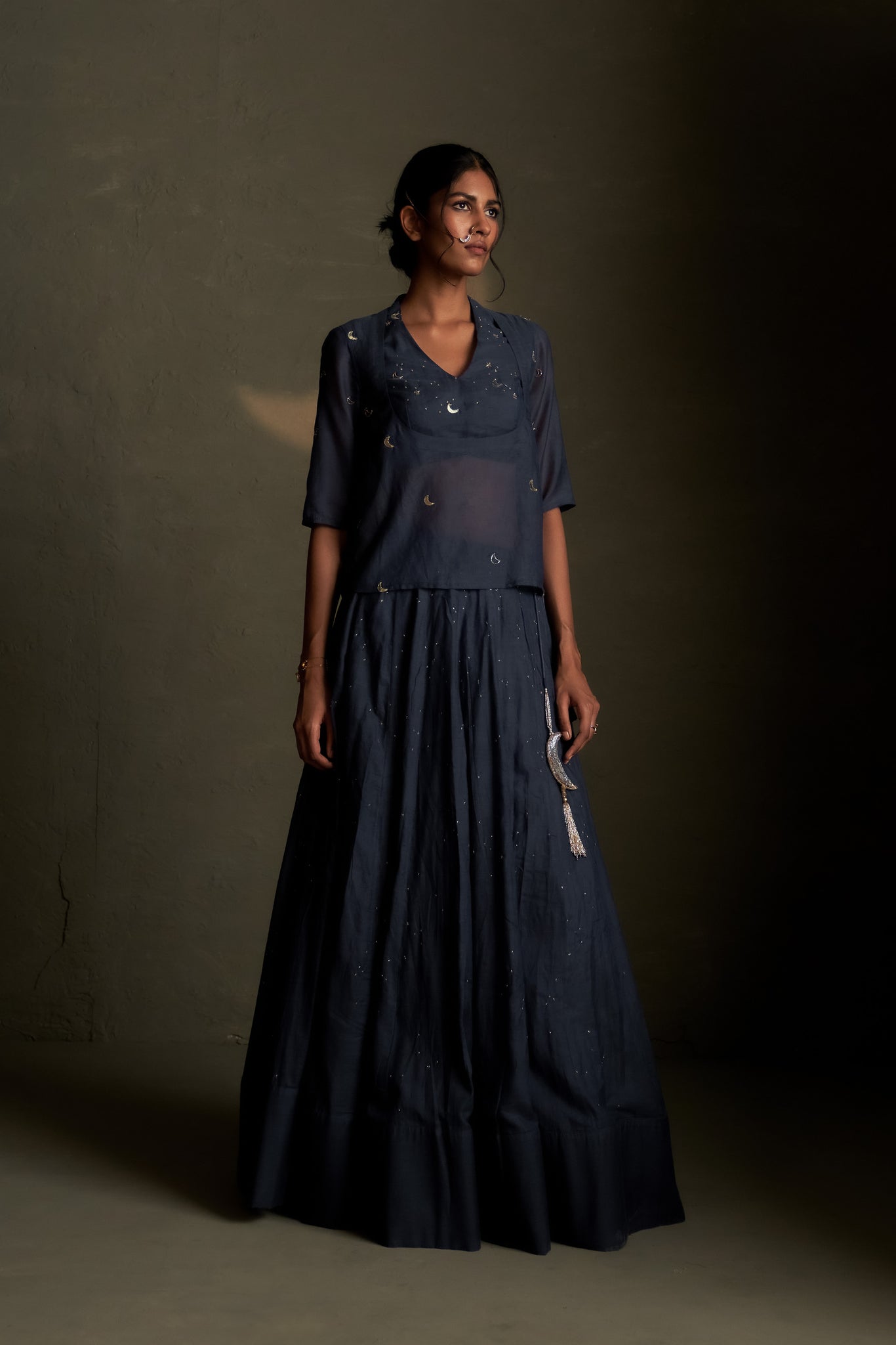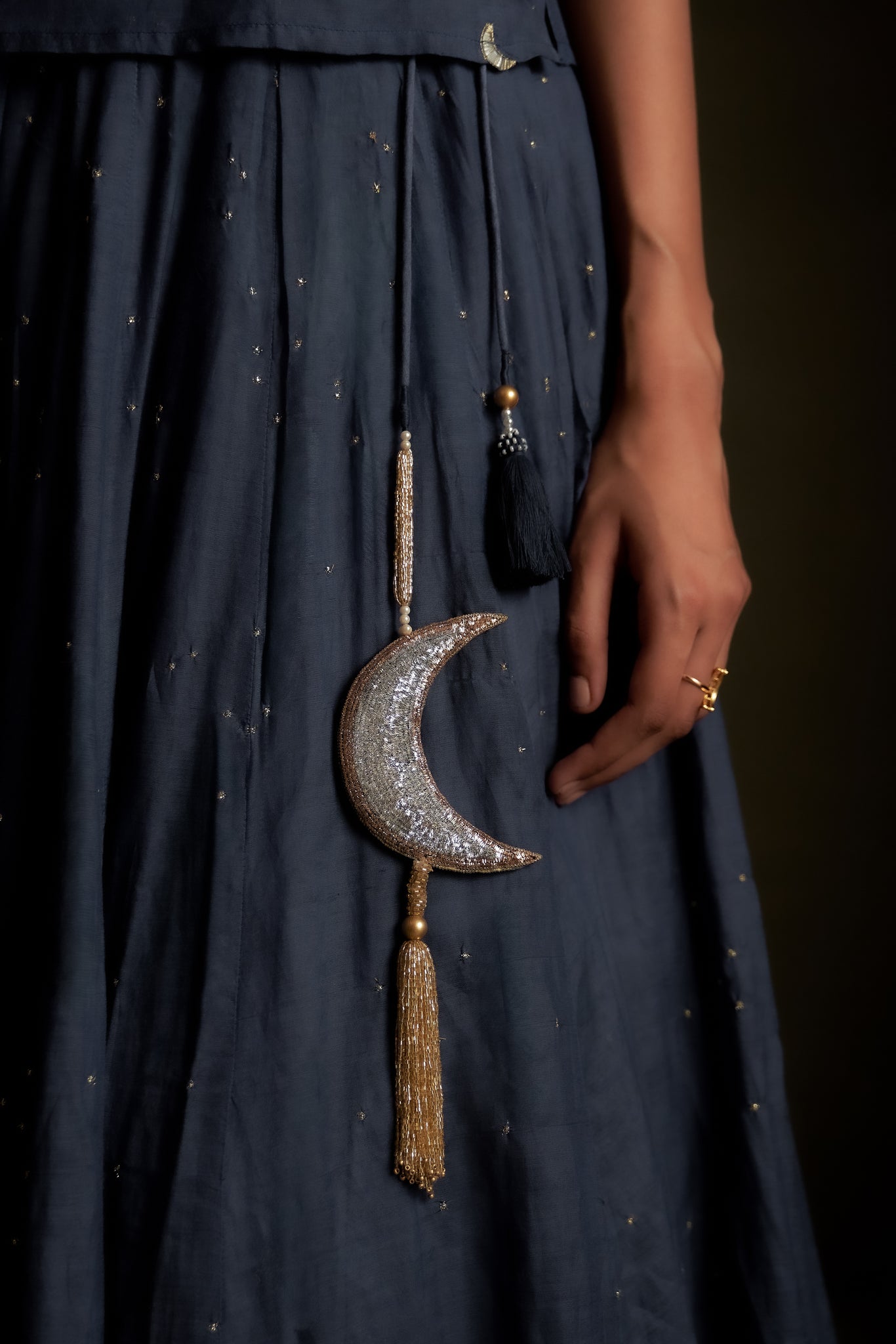 Introducing the Chaad Sitaara Lehenga Set, a mesmerizing ensemble that balances modern sophistication with timeless allure. The flared skirt is adorned with scattered star motifs, creating a night-sky effect, and finished with a glittering hand-crafted crescent moon tassel at the tie-up. The two-layered blouse features a sheer mul chanderi outer layer embroidered with delicate glass crescent moons, adding an ethereal touch. Completed with a broad mul dupatta showcasing a large crescent moon filled with star motifs and smaller glass crescents, this lehenga set embodies understated elegance and celestial charm, making a striking statement with effortless grace.