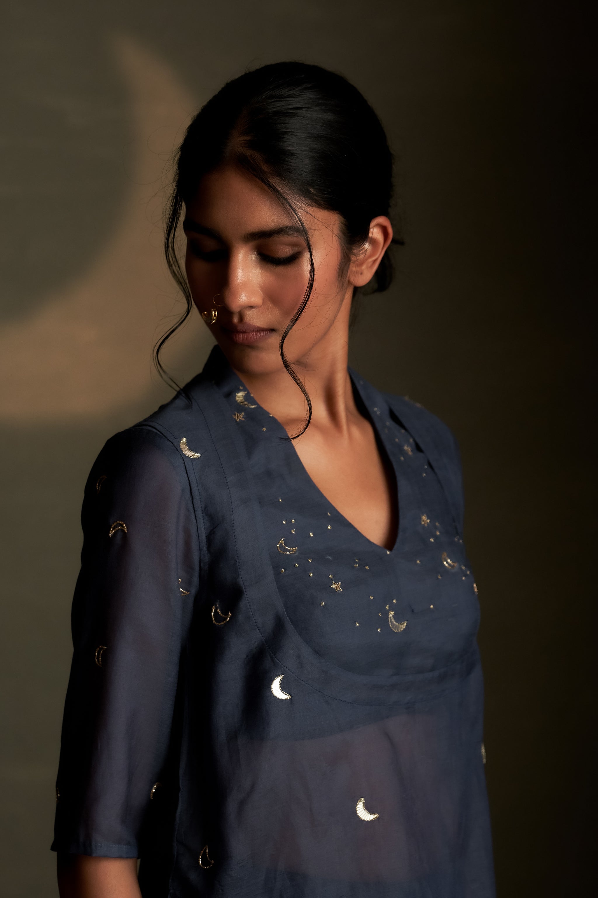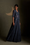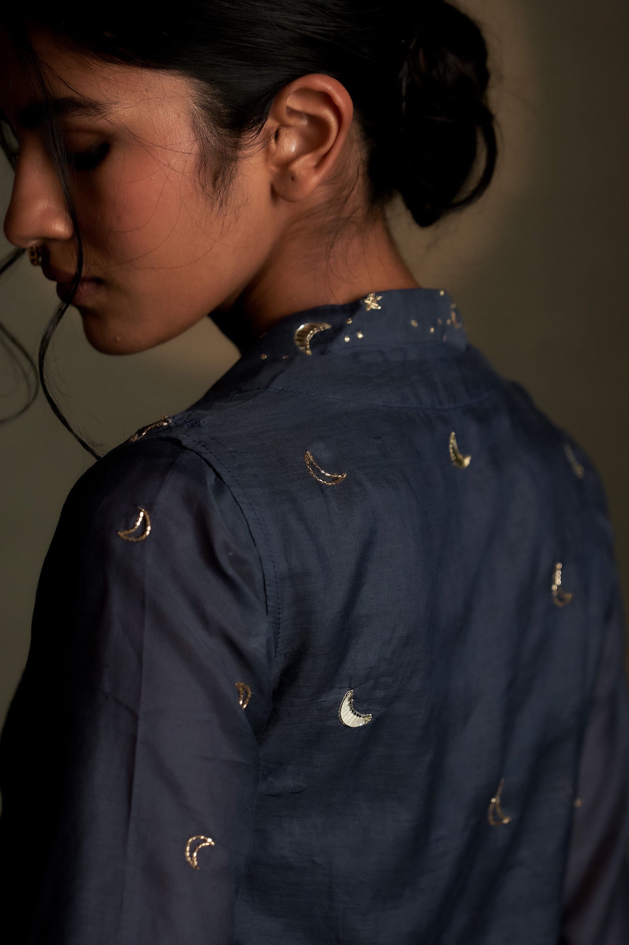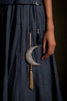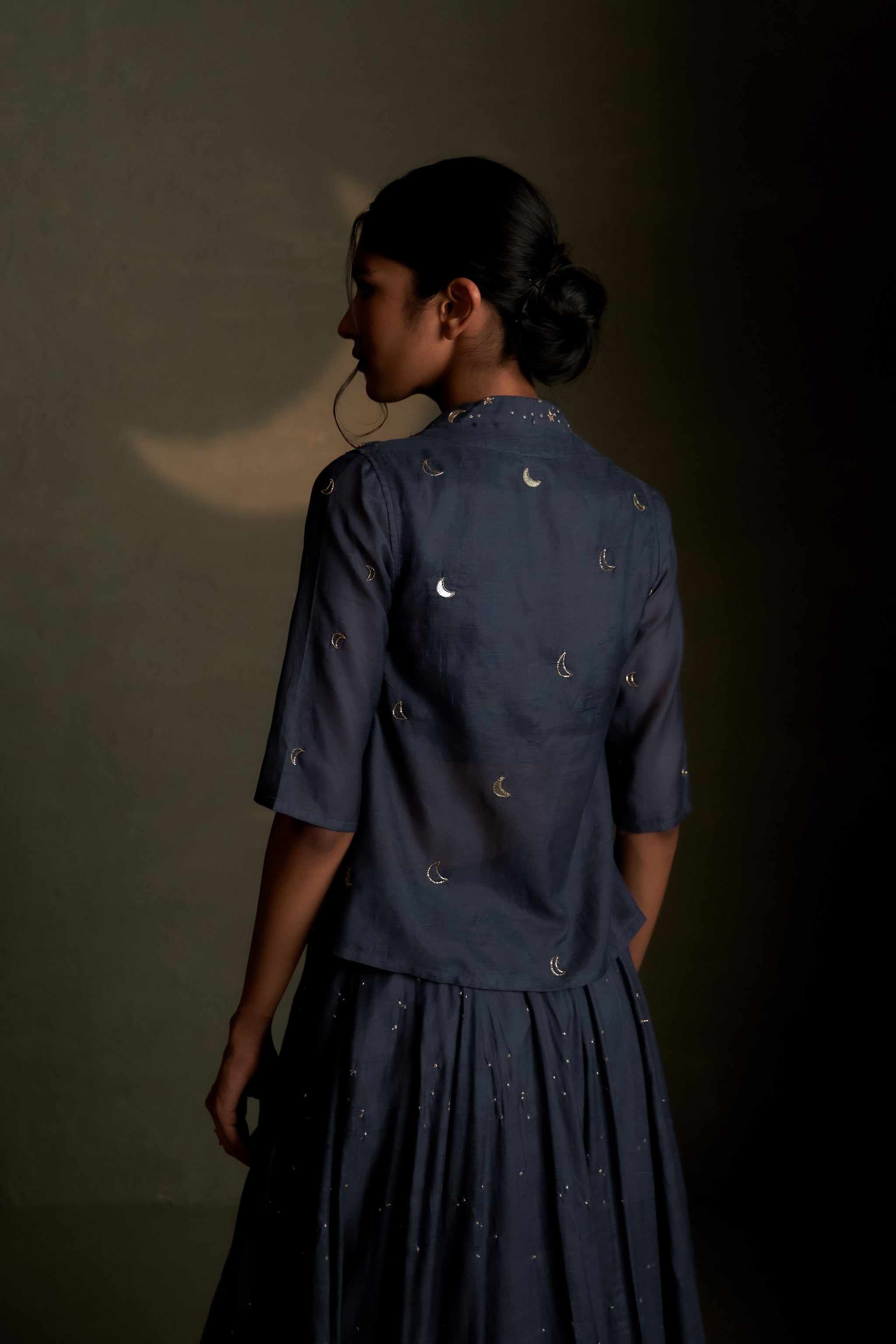 Introducing the Chaad Sitaara Lehenga Set, a mesmerizing ensemble that balances modern sophistication with timeless allure. The flared skirt is adorned with scattered star motifs, creating a night-sky effect, and finished with a glittering hand-crafted crescent moon tassel at the tie-up. The two-layered blouse features a sheer mul chanderi outer layer embroidered with delicate glass crescent moons, adding an ethereal touch. Completed with a broad mul dupatta showcasing a large crescent moon filled with star motifs and smaller glass crescents, this lehenga set embodies understated elegance and celestial charm, making a striking statement with effortless grace.