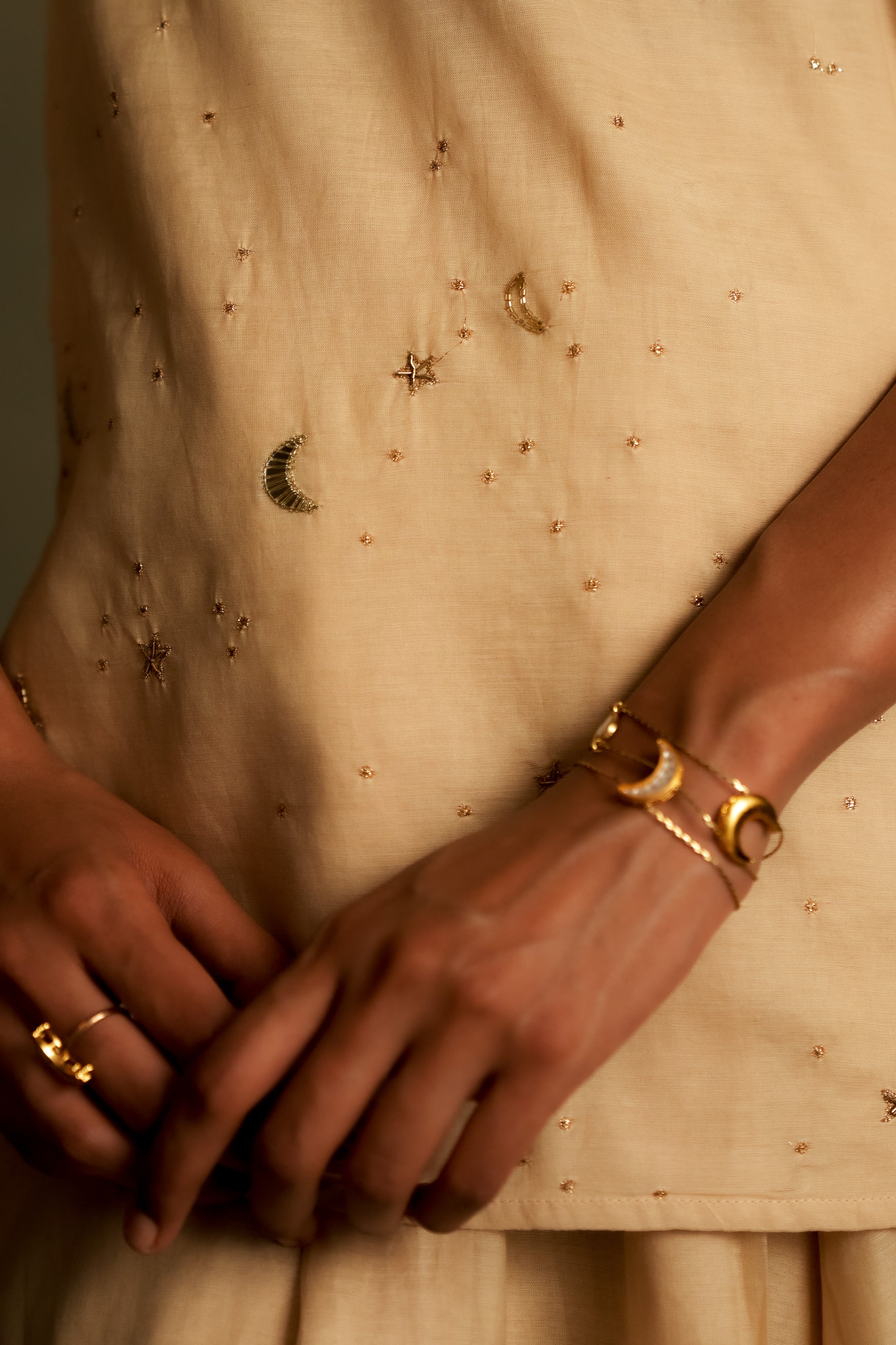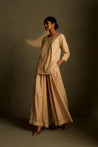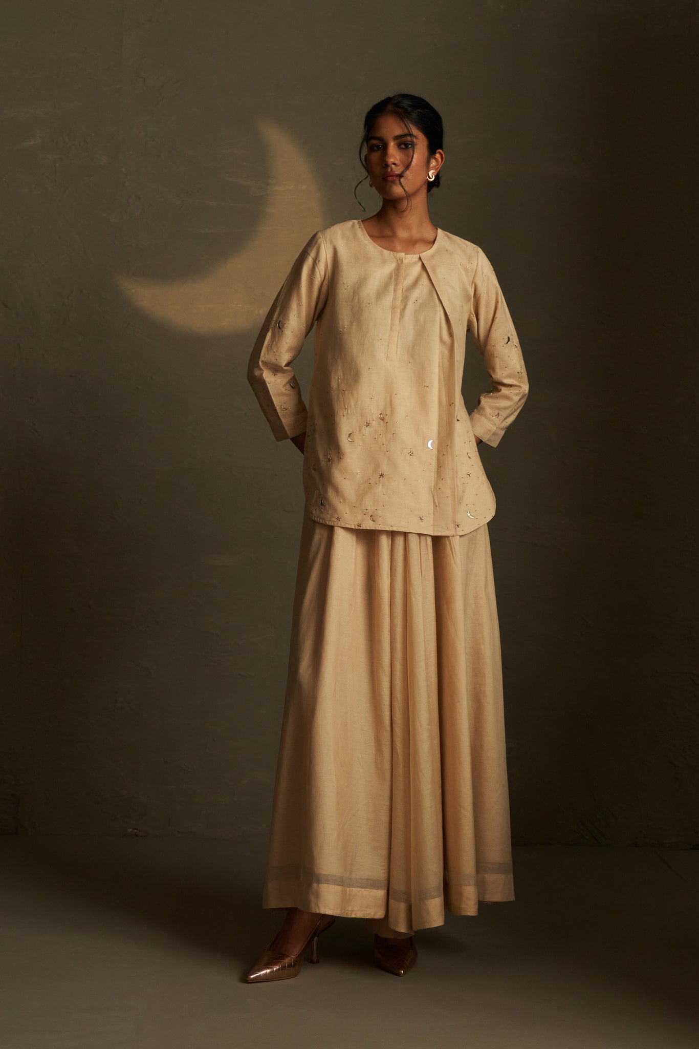 Introducing the Chaand Kurti Skirt Set, a moon dusk beige ensemble that embodies subtle elegance and festive charm. It features a divided flared skirt paired with a short kurta-style top, intricately embroidered with delicate star motifs and a crescent moon in glass. The refined detailing and soft hue lend the outfit a contemporary yet timeless appeal, perfect for understated celebrations.
