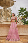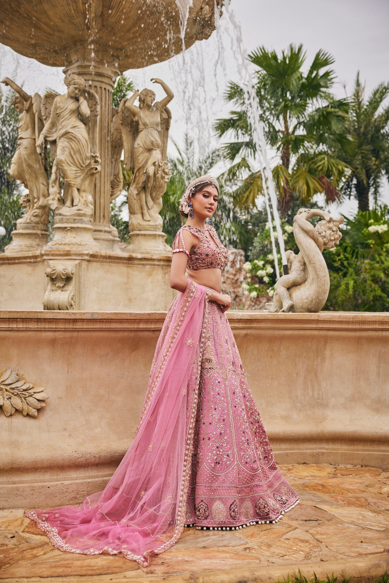 In a dreamy flamingo pink hue, this lehenga set exudes elegance and charm. The lehenga features exquisite Lakhnawi embroidery, intricately adorned with kasab poat, fine threadwork, and delicate jardosi detailing, adding a rich handcrafted texture. Paired with a uniquely designed blouse, it stuns with crystal embellishments and statement mother-of-pearl sleeves that shimmer with every movement. The matching dupatta completes the ensemble with grace, making this couture piece perfect for festive occasions, weddings, or bridal functions where traditional artistry meets modern sophistication.
