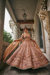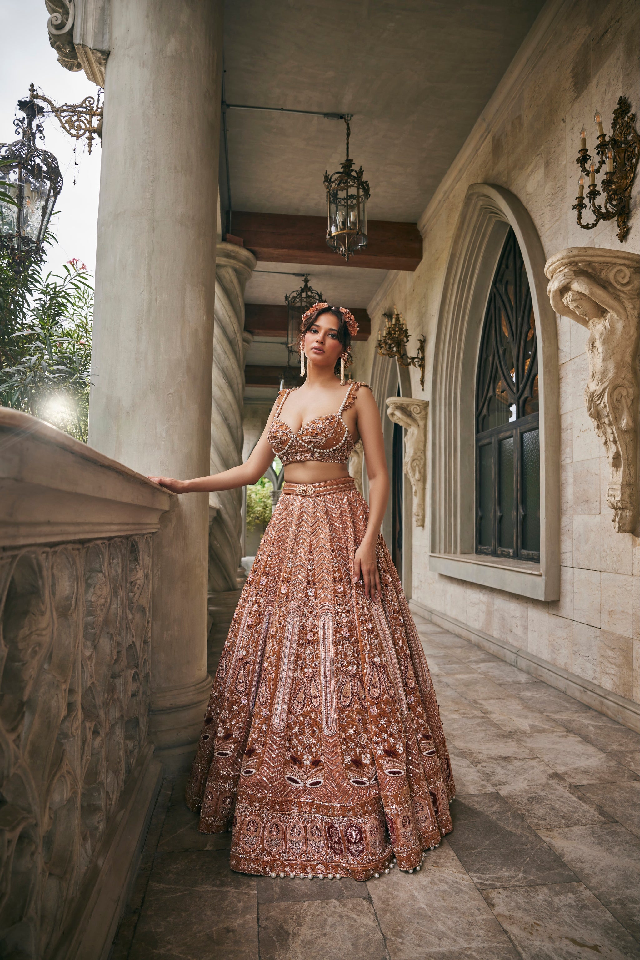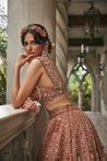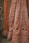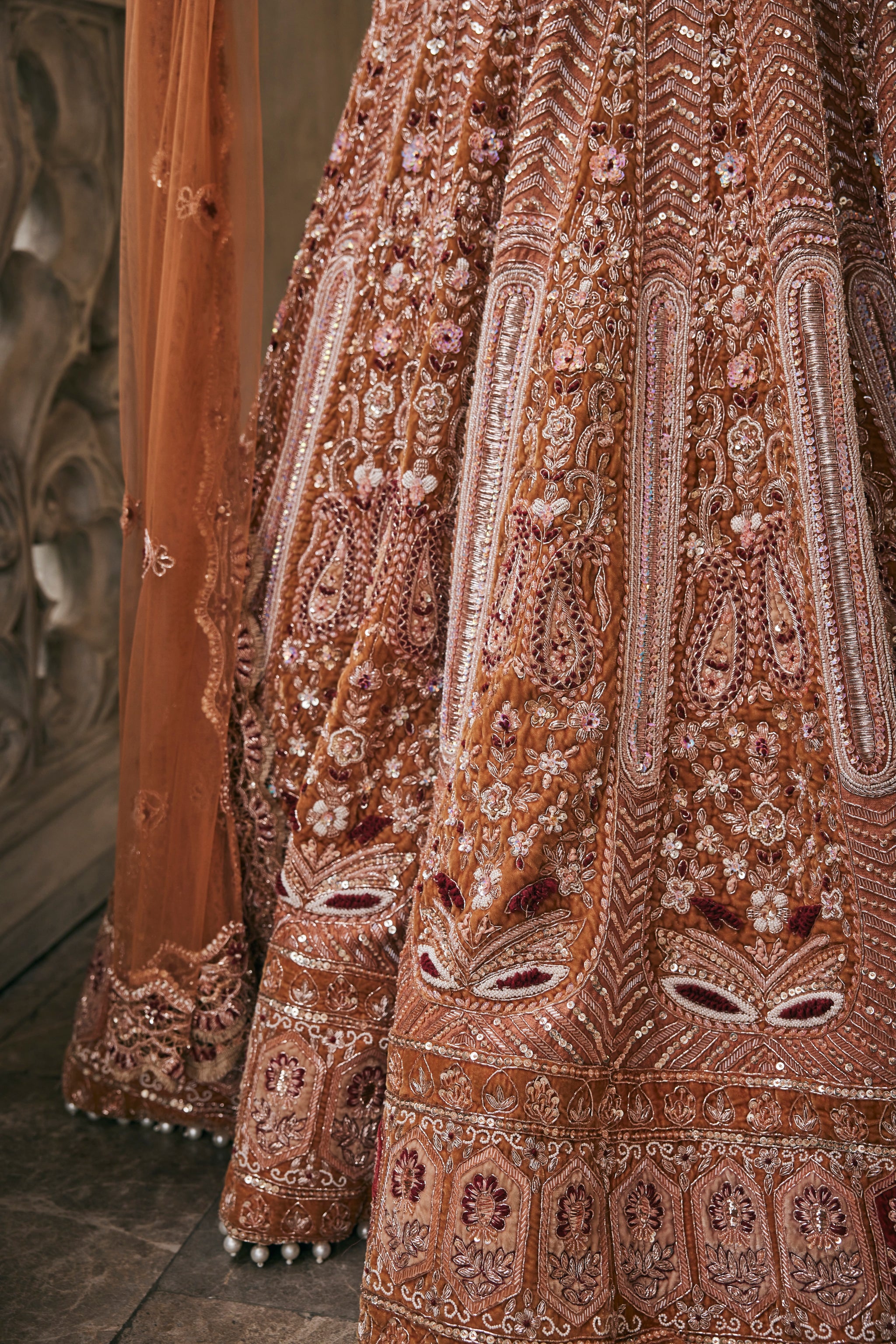 A rich caramel raw silk lehenga adorned with velvet appliqué, featuring paisleys and chevrons embroidered in golden and rose gold glass beads. Maroon threadwork, done in a fine knitting technique, adds depth, while pearls lend a regal shimmer. The blouse is a modern silhouette with Indian touches, detailed with the same maroon knitted embroidery and matching velvet. The dupatta is crafted in soft net with intricate cutwork borders, balancing elegance and grandeur. A timeless bridal look that is opulent, artistic, and royally enchanting.