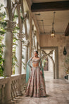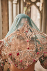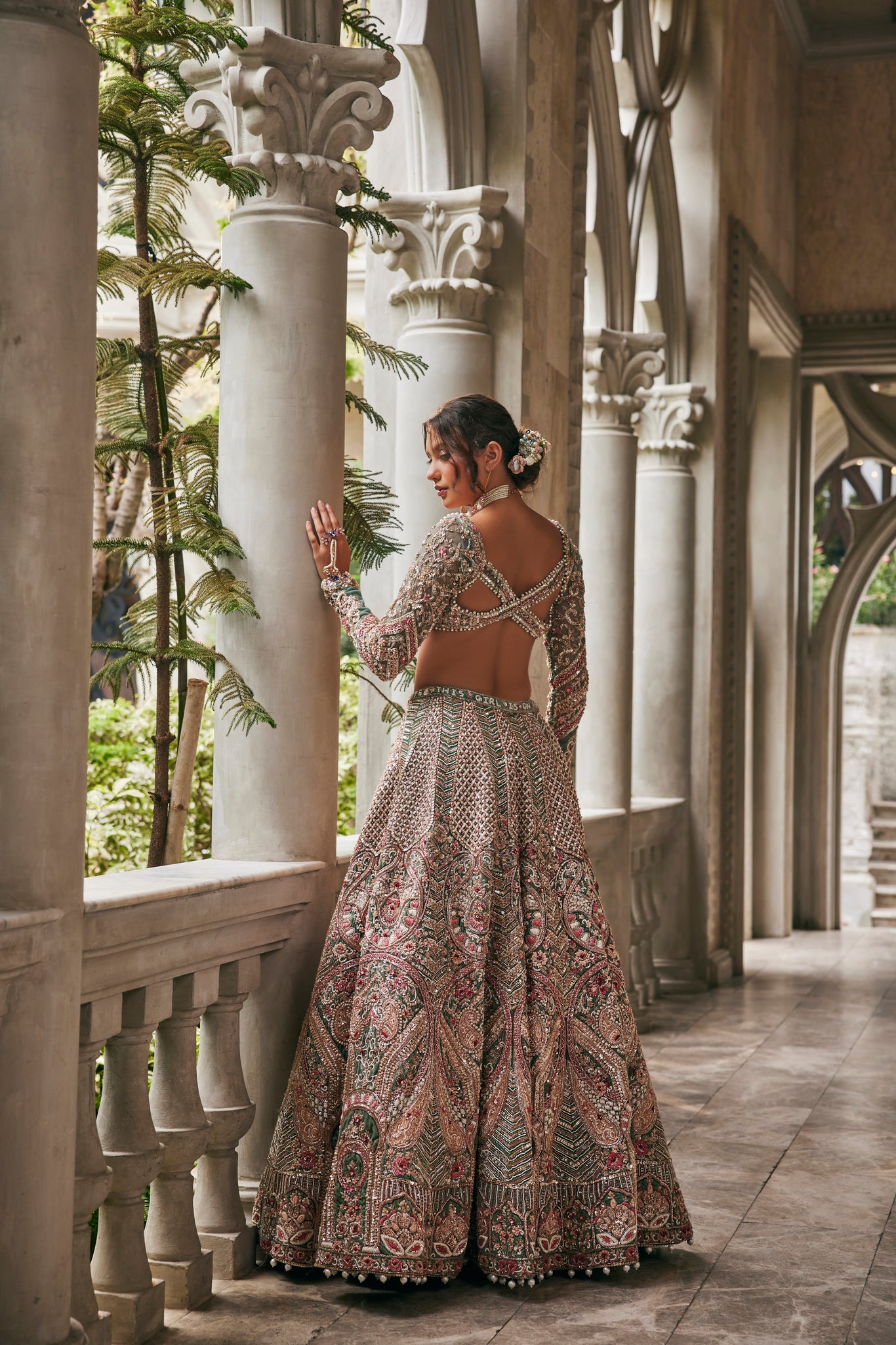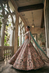 A striking teal ocean green lehenga set, crafted in rich velvet and entirely hand-embroidered with intricate detailing. The lehenga features hints of carnation pink and red threadwork and a unique engraved belt that reads “This girl is on fire.” The velvet and net blouse comes with full sleeves adorned with delicate cutwork. Paired with a net-organza dupatta finished with triangular ends, this ensemble offers a bold, empowering statement with a unique, modern twist on tradition.