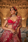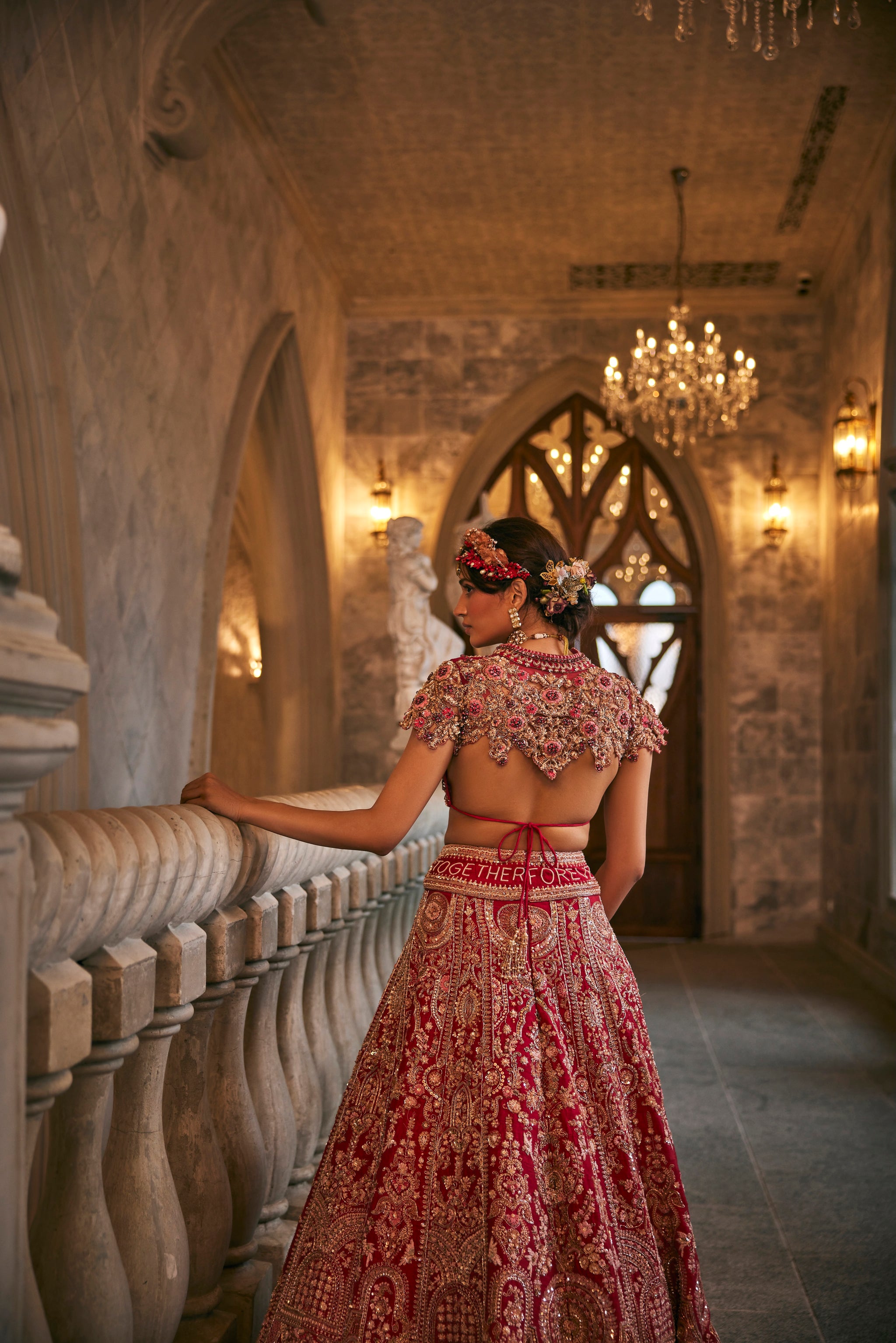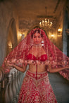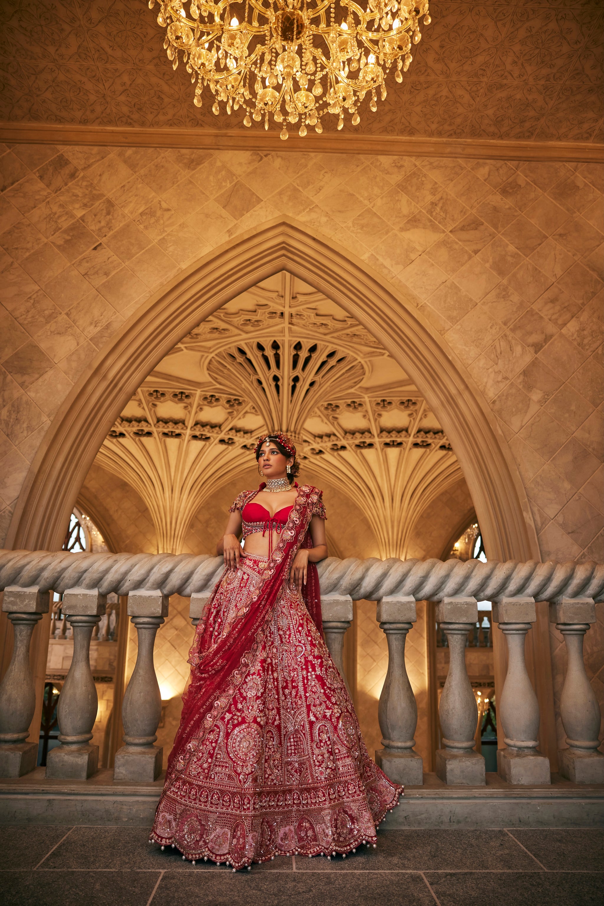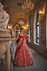 Drenched in a regal raspberry pink, this lehenga set is a celebration of heritage and fine craftsmanship. The highlight is its exquisite dupatta—adorned with delicately embroidered swans along the border and sacred Swastik motifs spread across the fabric, symbolizing grace and auspiciousness. The lehenga and blouse are intricately embellished with rich zardosi, poat, and a medley of traditional embroidery techniques, making the ensemble a perfect blend of elegance and spiritual symbolism. Ideal for brides or festive occasions that call for a statement steeped in cultural artistry.