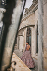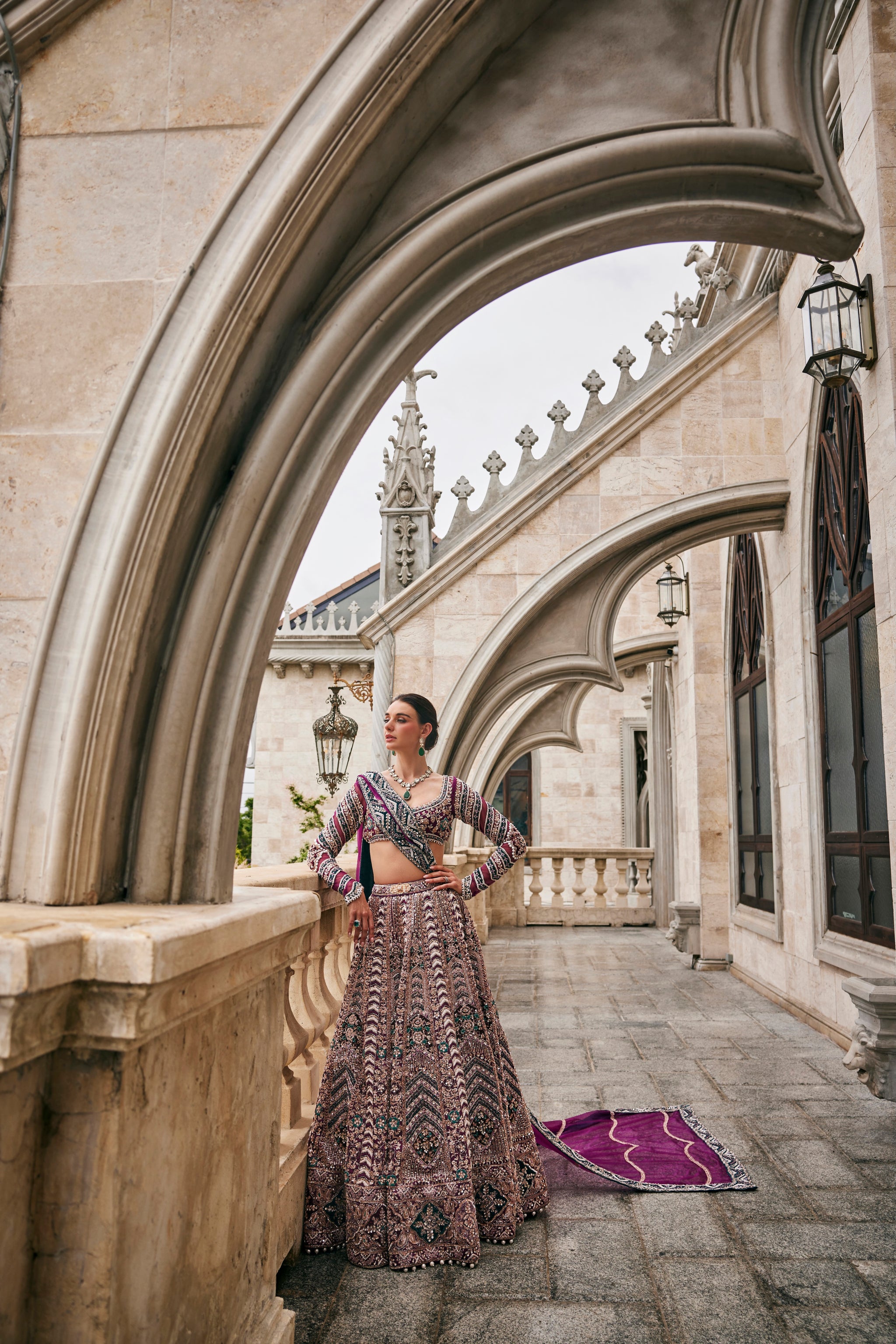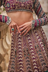 A festive deep berry wine lehenga paired with rich deep teal green velvet appliqué on the lehenga, dupatta, and blouse sleeves. The embroidery is regal, featuring zardozi with elegant pearls and subtle glass beads, flowing vertically for a lengthening effect. The blouse has a modern twist with V-shaped patterns on the sleeves, elongating the arms while maintaining elegance. The overall look is a blend of classic richness and contemporary finesse. perfect for a bride who wants timeless charm with a bold, royal edge